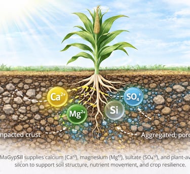 MaGypSil is a blended mineral soil amendment combining hydrated magnesium silicate with naturally mined agricultural gypsum. It is designed to improve soil structure, cation exchange, and long-term soil chemical stability while supplying calcium, magnesium, sulfur, and plant-beneficial silicon.